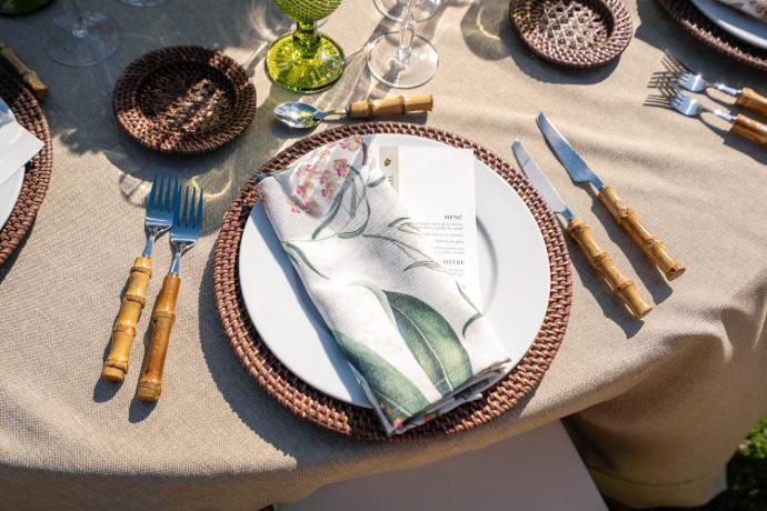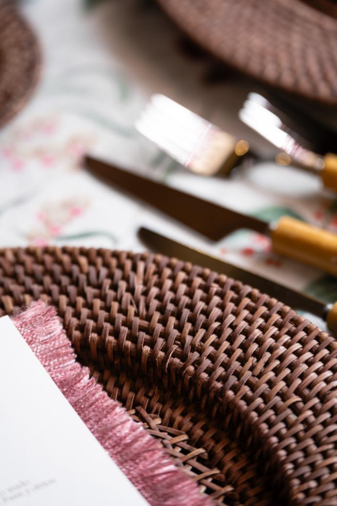 Bajoplatos de fibras naturales, que aportan textura y conectan con lo orgánico.