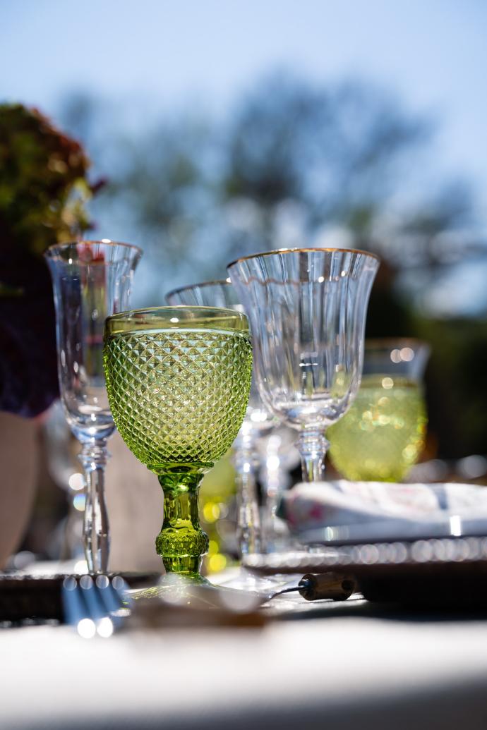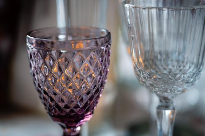 Cristalería tallada, con copas en tonos amatista y transparentes que añaden un punto elegante y delicado.