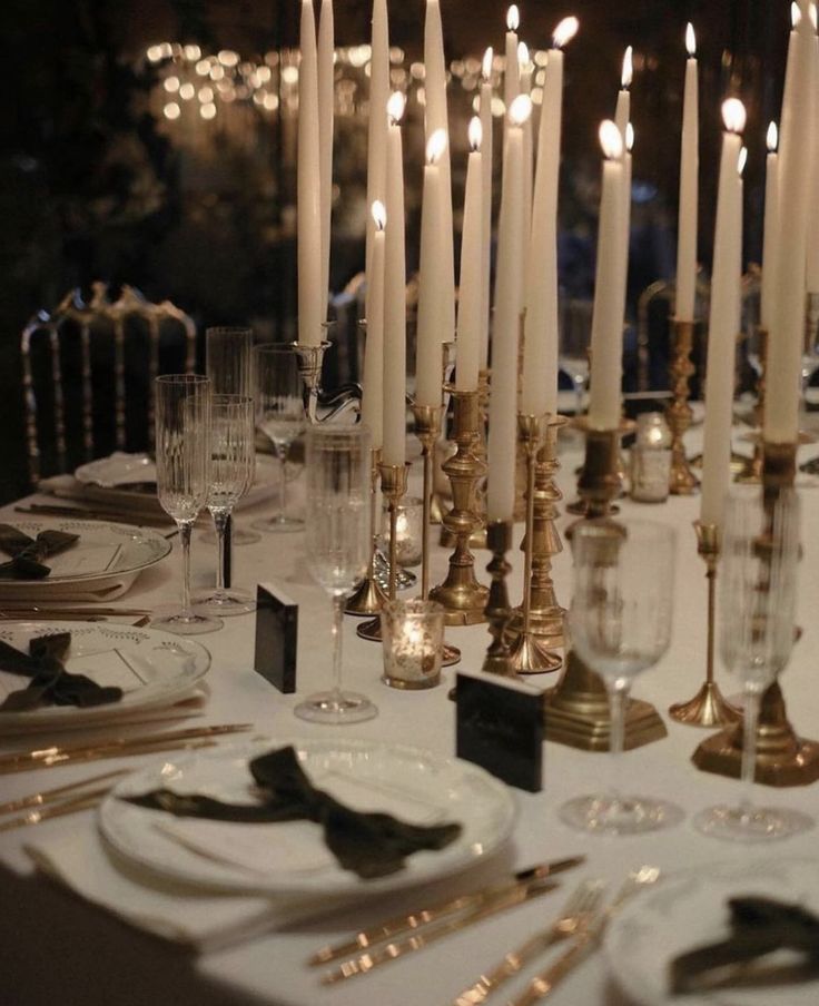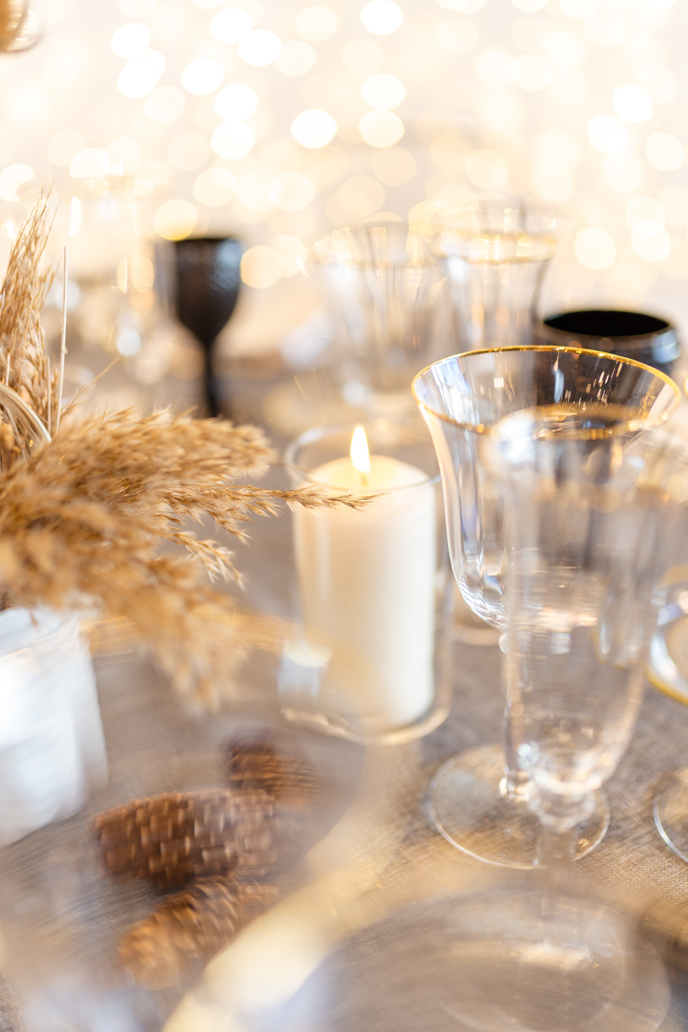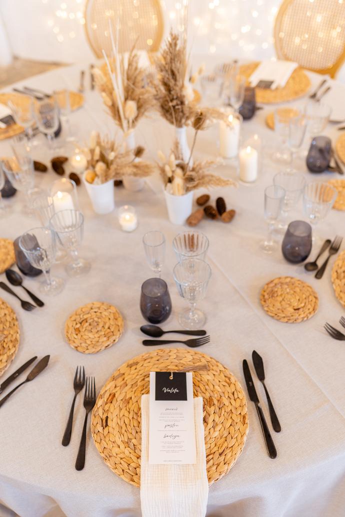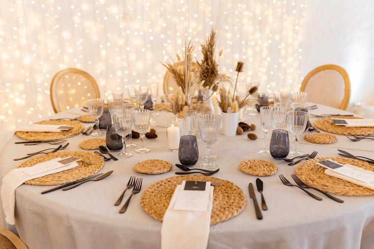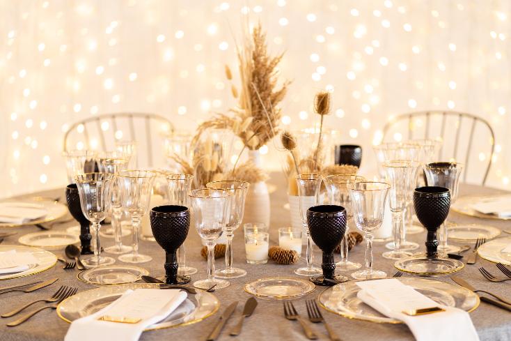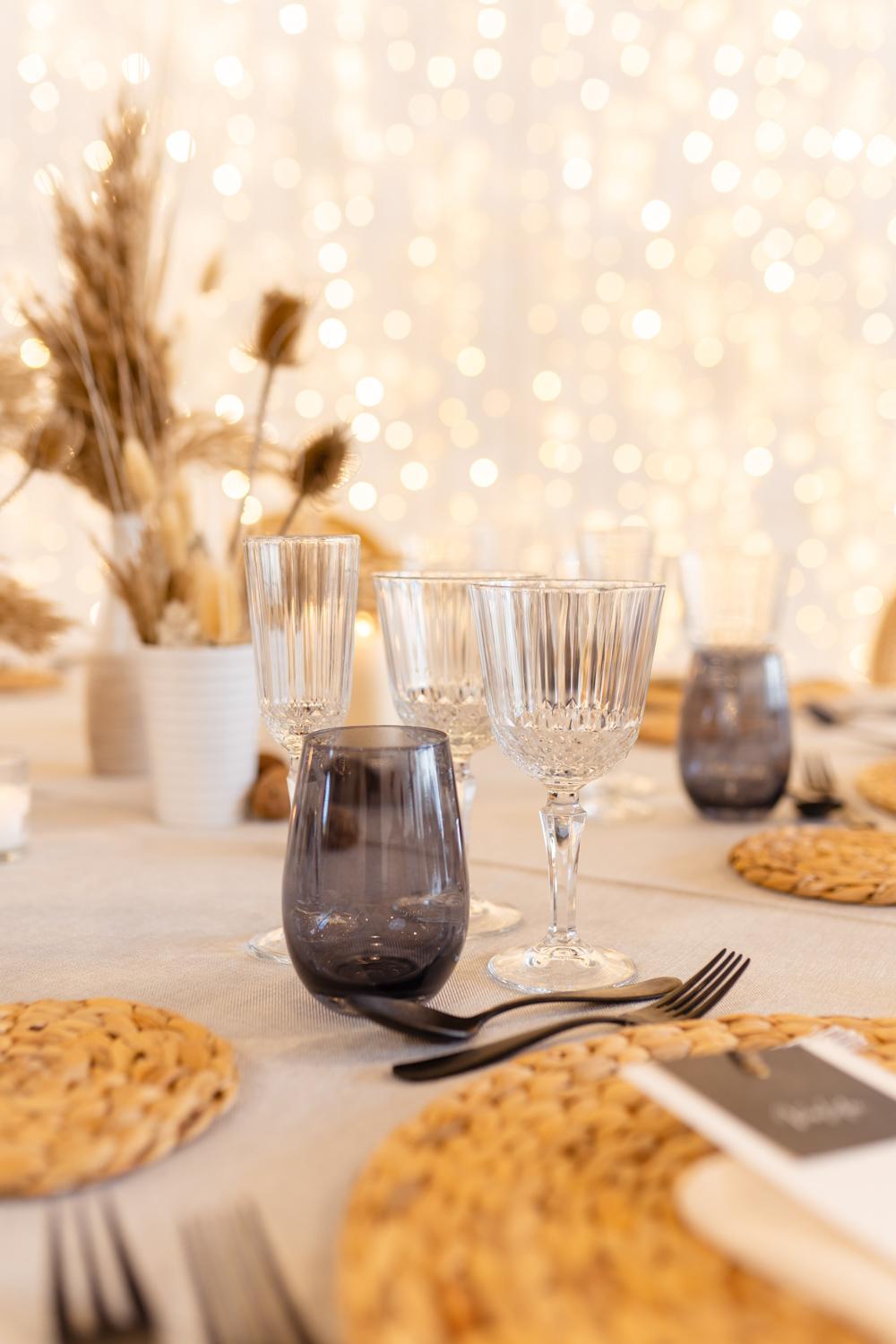1. Ocres y dorados en tu mesa: La primera propuesta es añadir tonos tostados para aportar un toque más cálido y mágico a vuestra mesa. Nos olvidamos por completo de la idea clásica de Navidad en rojos, verdes y dorados. Lo conseguiremos gracias al bajo plato y plato de pan de mimbre, combinado con la servilleta de muselina blanco hueso para darle un toque de luz al conjunto. La cristalería tallada con sus diferentes facetas aporta un extra de brillo, incluyendo el vaso de agua gris crearemos un contraste muy especial que podemos reforzar con la cubertería negra como en las fotos o mantener una cubertería más sencilla si lo prefieres. Sin duda se trata de una apuesta diferente y elegante que llamará la atención de tus invitados.