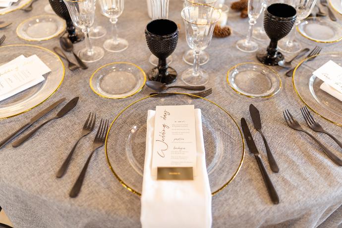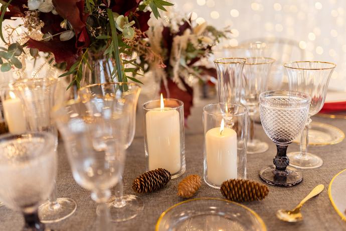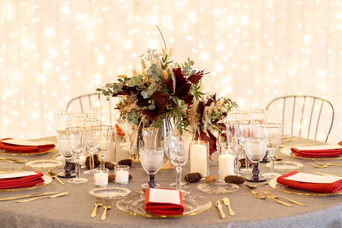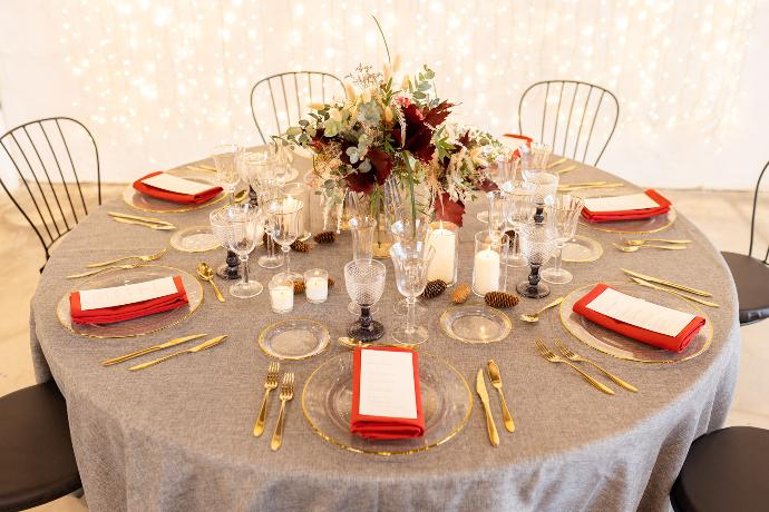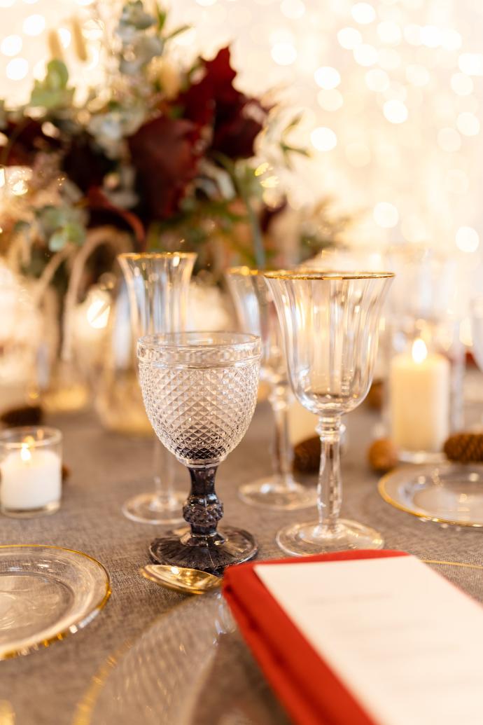 1. Apuesta por el rojo: en esta primera propuesta que os hacemos, os sumergirá en la más clásica de las navidades. Combina la servilleta rojo cereza con los cubiertos dorados, tanto el plato de presentación como la cristalería, hemos elegido cristal con filo dorado para añadir brillo y sofisticación al conjunto. Nos encanta el resultado.