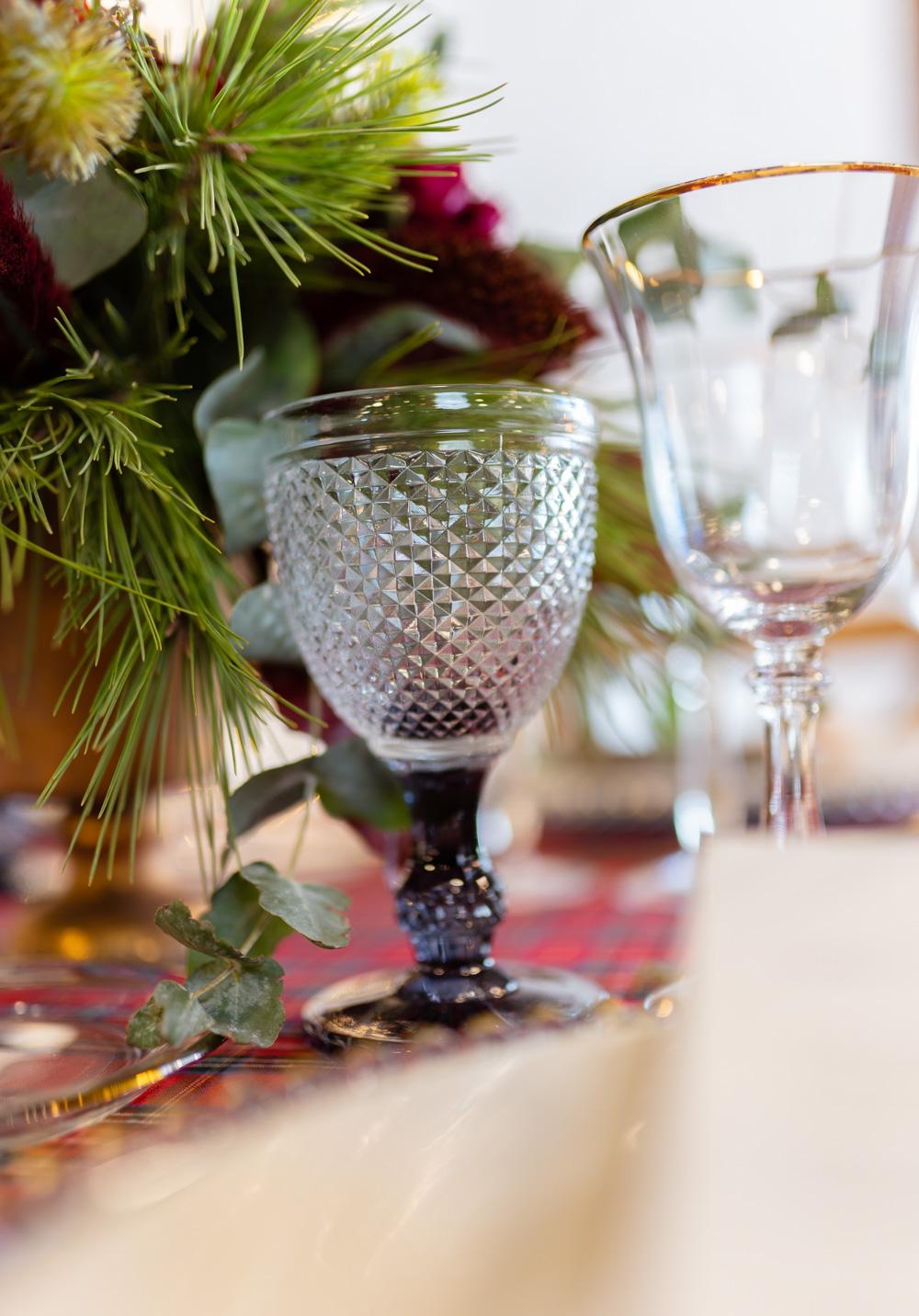 En este conjunto, la copa de rombos negra quedará impresionante, una apuesta arriesgada, pero a la vez elegante, perfecta si además añadimos la cubertería negra mate. Como toque final, servilleta en blanco. Una mesa llena de contrastes donde las flores y el resto de los elementos decorativos, como velas, piñas, bolas de Navidad y lucecitas…. harán que esta mesa sea especial y tan navideña como tu quieras.