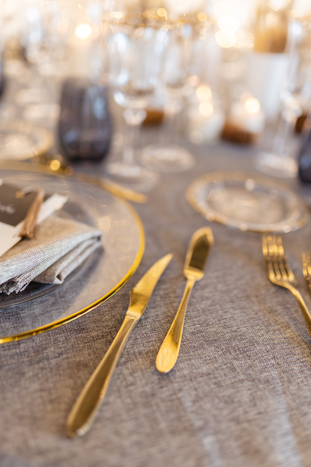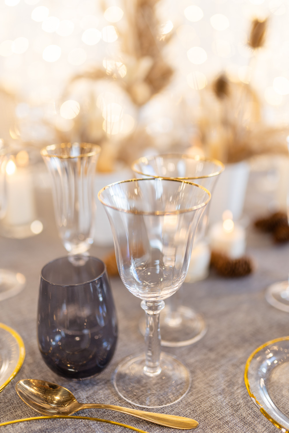 Os recomendamos utilizar elementos muy sencillos, sin recargos ni estridencias, los platos de presentación en cristal trasparente con el filo dorado, las copas a juego