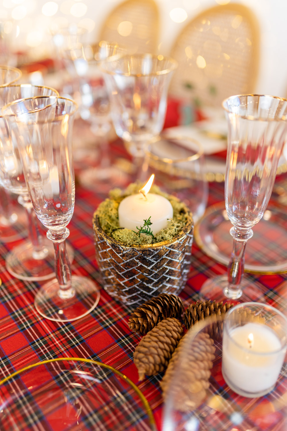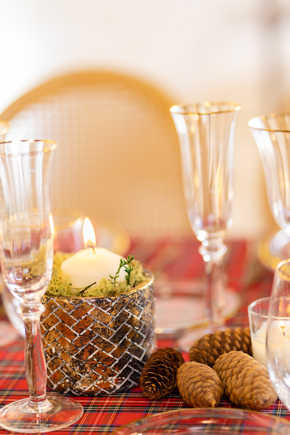 Manteles clásicos, cuberterías para una ocasión especial, toques sutiles dorados, un toque de verde, piñas naturales, coronas en verde con detalles rojos...
