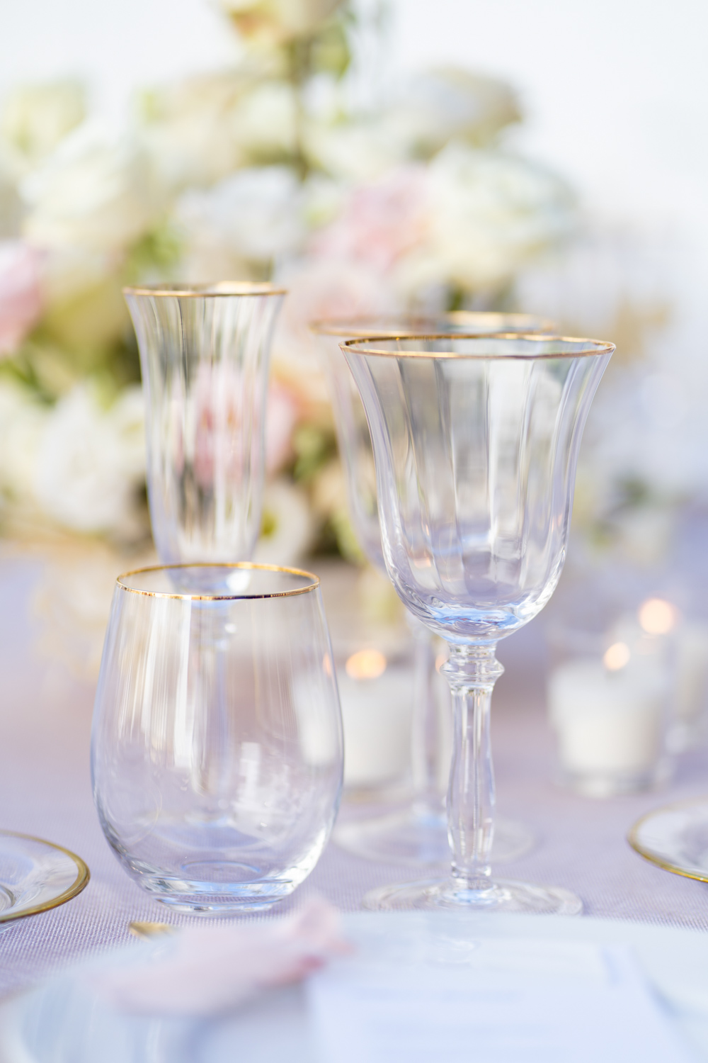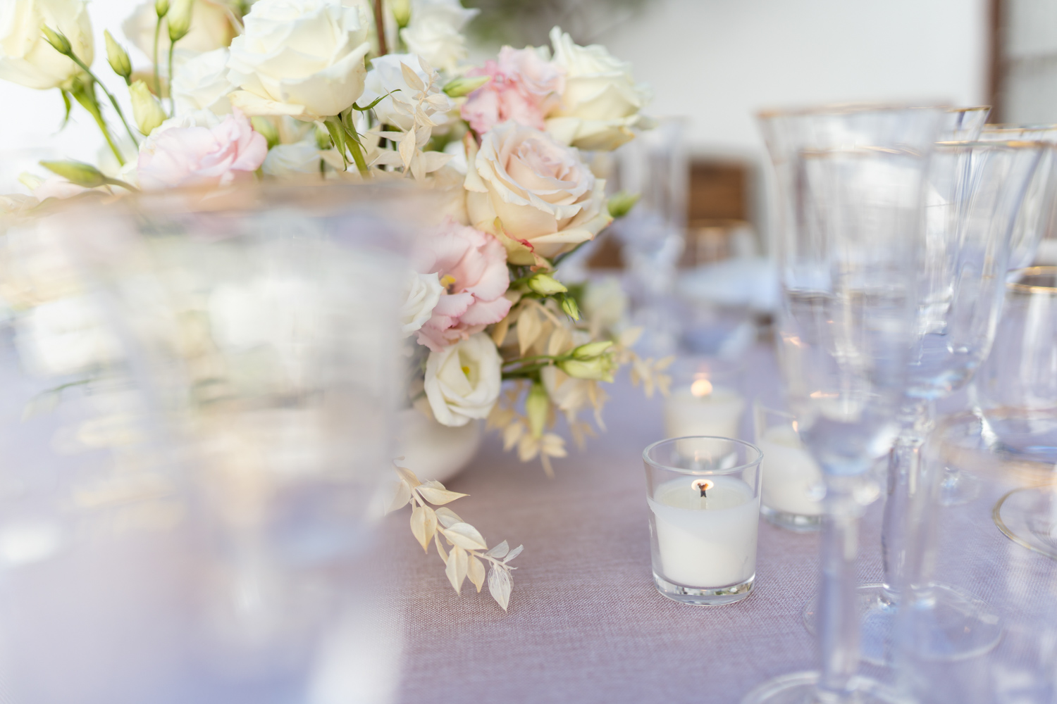 centros de mesa románticos con flor tipo rosa, así como cristalería en cristal trasparente y cubertería dorada