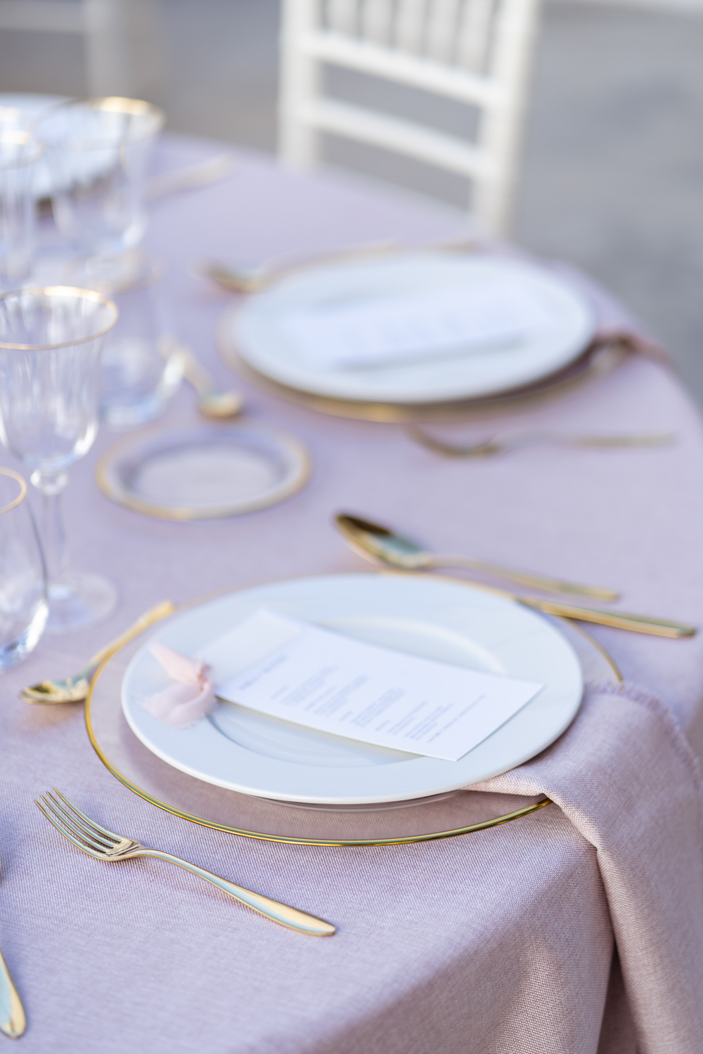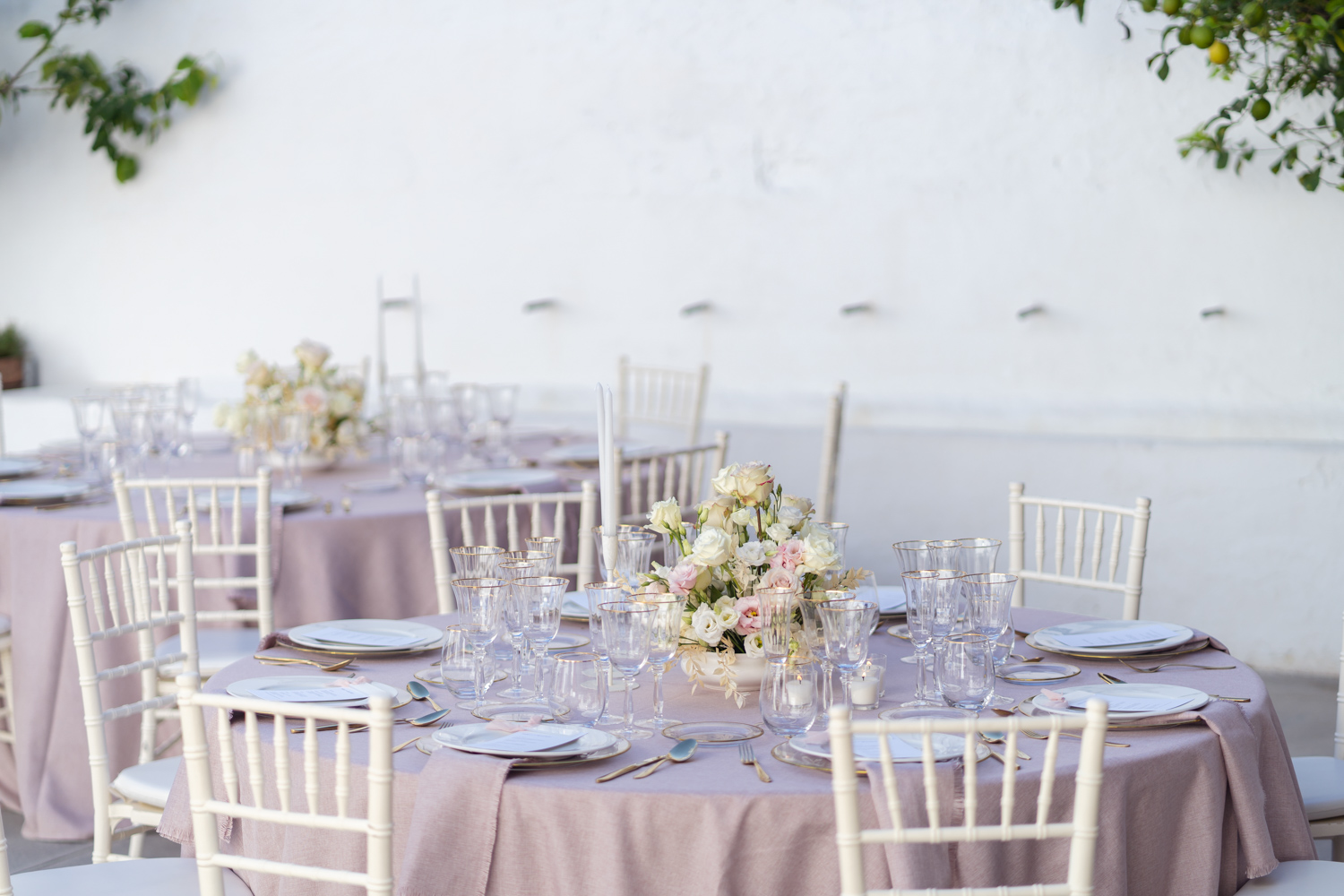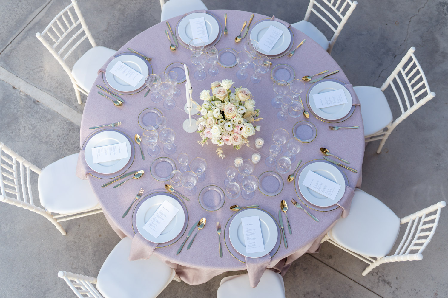 Mantelería en colores muy suaves, cristalería trasparente, cubertería especial para cada plato, velas en tonos neutros y sillas Modelo Tiffany